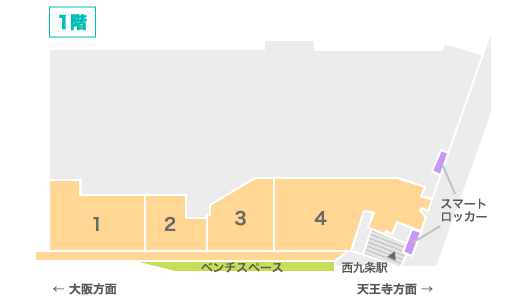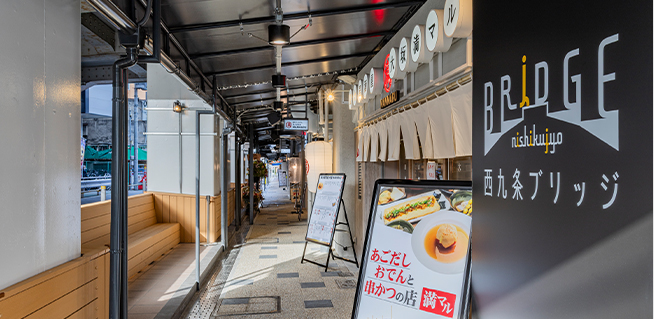 JR 大阪環状線「西九条」駅高架下に誕生した、賑わいと憩いの空間。気軽に立ち寄れる飲食店とベンチスペースを備えています。「手ぶら観光」をサポートするスマートロッカーも併設しています。